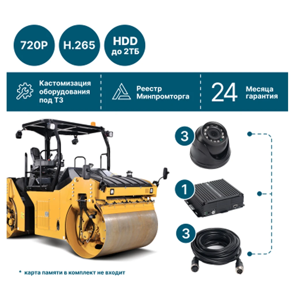NSCAR ST301_HDD — комплект профессионального видеонаблюдения, разработанный для эксплуатации на дорожной технике: асфальтоукладчиках, катках, разметочных машинах и дорожных фрезах. Система фиксирует происходящее в HD-качестве и поддерживает запись как на HDD/SSD диски до 2 ТБ, так и на SD-карты памяти до 512 ГБ. Это позволяет гибко выбирать носитель данных и хранить длительные архивы.